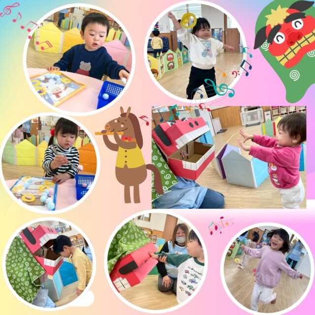 だるま積み・指先あそび・くるくる凧を3つのコーナーに分け、それぞれ好きなあそびを見つけて楽しみました⭐︎