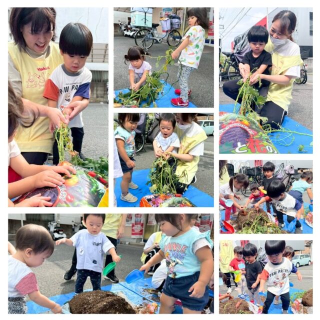 5月にブログで紹介させていただいた、子どもたちとさつまいもの苗を植えた事を覚えていますか?先日、子どもたちと一緒にさつまいもを収穫しました♪収穫前に「いもほりよいしょ!」という絵本を読んでからお外へGO💨お外に出ると袋で育てたさつまいもが“ど〜ん!”とスタンバイされていて、子どもたちは釘付けになって見ていました🤩絵本で見たように一人ずつ茎を持って「よいしょ!よいしょ!」と引っ張りました!なかなか出て来ないので保育士もお手伝い♪土の袋を切って開けると「わぁお!」と興味津々な子どもたち♪葉っぱに隠れていたたくさんのバッタが出て来て「バッタおる!」「こっちにもいるよ!」とバッタに大興奮🦗🦗