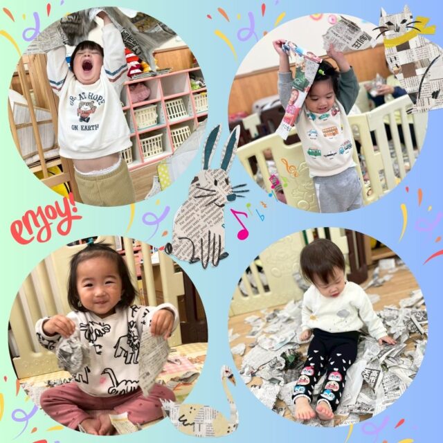 ほくと保育園では新聞遊びをしました!はじめに保育士が「新聞あそびするよ〜!」と言って新聞をビリビリ破り始めると「え!」と驚いた様子がありましたが、破った新聞を上に投げてひらひら〜と落ちてくると嬉しそうに手を伸ばして触っていましたよ🌟