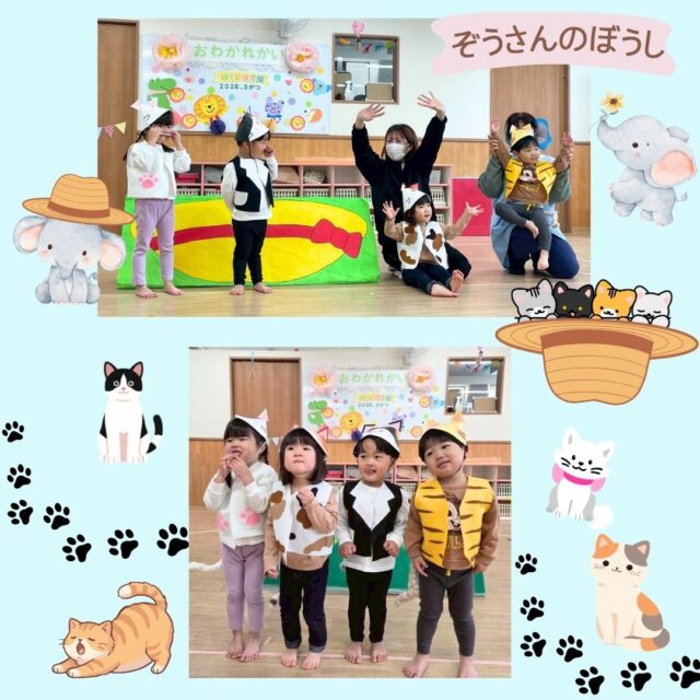 2歳児さんの出し物『ぞうさんのぼうし』ではかわいいお歌の世界を見せてくれました♥ みんな大好きなネコちゃんになりきって参加してくれましたよ😺