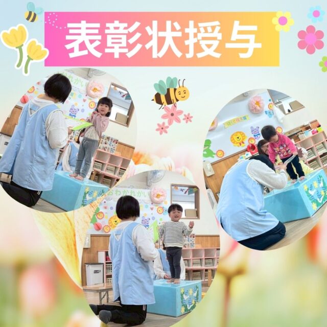 表彰状授与でのトップバッターは、つぼみ組(0歳児)のお友だち!緊張感ある雰囲気にも動じることなく、とっても上手にお辞儀をし表彰状を受け取っていました!ちゅうりっぷ組、たんぽぽ組、と年齢が上がるにつれ、「気をつけピ!」が上手だったり、お辞儀をカッコよくできたりと素敵な姿を見せてくれました🎶