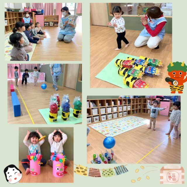 節分では、「鬼のパンツ」の絵本を見て一緒に楽しく歌いながら楽しんだ後、ペットボトル、トイレットペーパーで作った鬼の顔のピンでボーリングを楽しみました。鬼のピンが上手に倒れると腕を上に挙げたり、ジャンプして喜びを表現していました。
