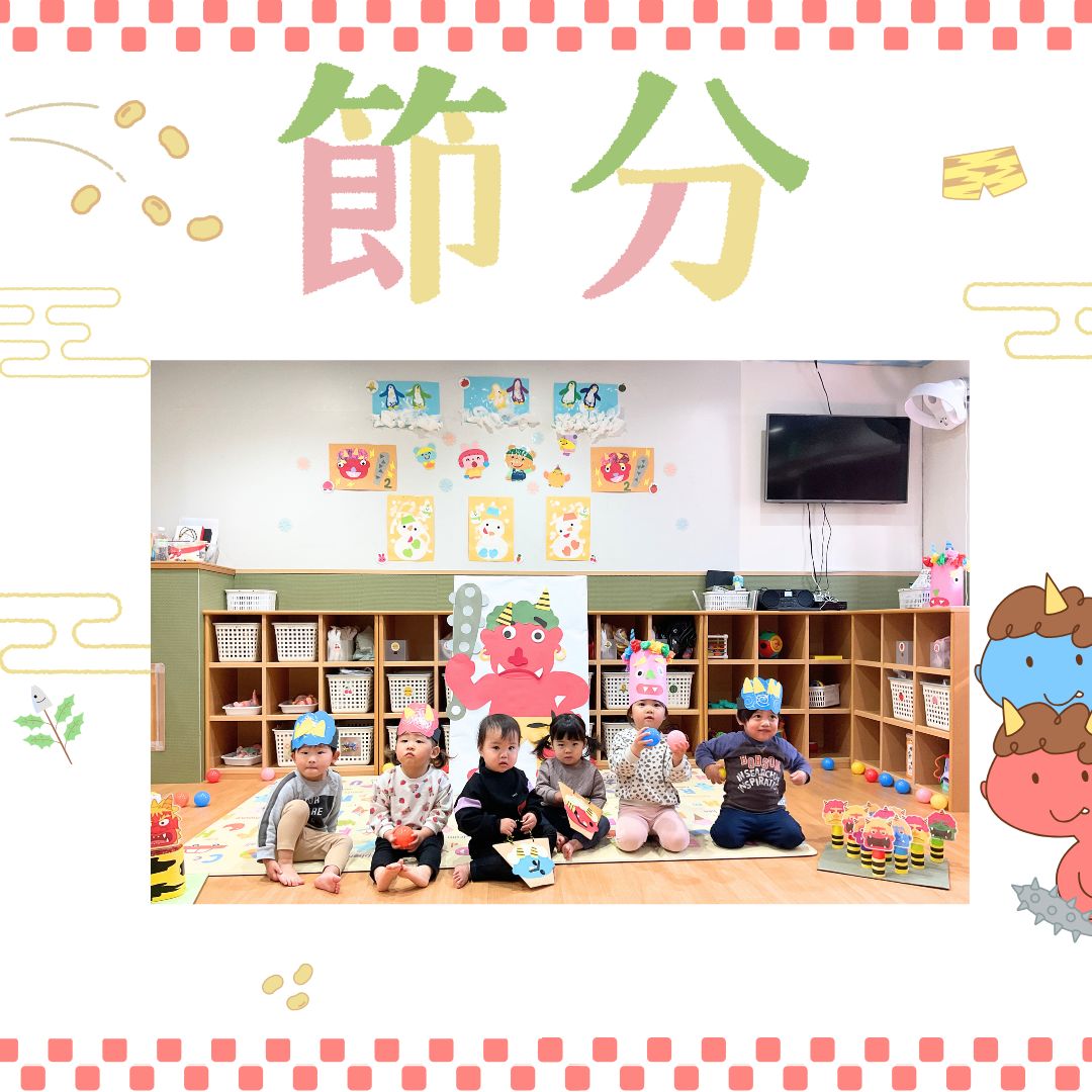机に貼ったのっぺらぼうの鬼に1人1パーツずつ付けて顔を完成させ「鬼はーそと!!」と言いながらボールを当てて遊びました。サプライズで鬼のお面を付けた保育士が出てくると、少し驚きましたがハグをしてもらったり、頭を撫でてもらいお友だちになり、ばいばいをして終わりました♪