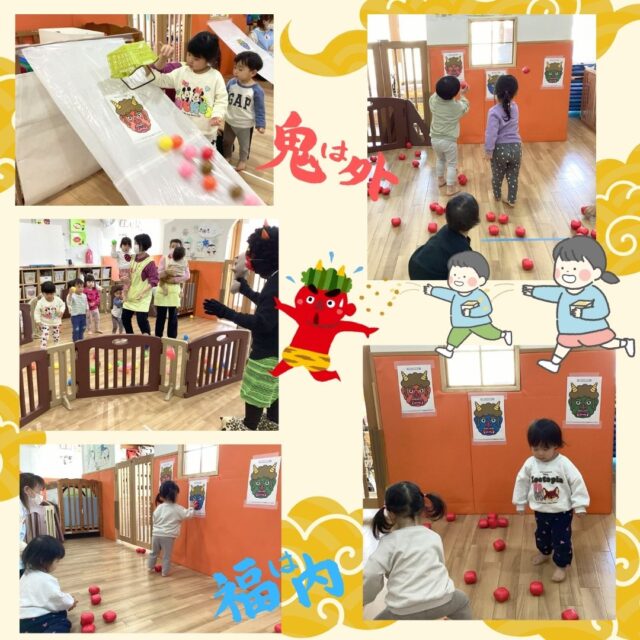 そして2月3日の節分の日、紙芝居や絵本をみて「みんなのおなかの中にいる病気鬼や、怒りんぼ鬼、泣き虫鬼をやっつけるんだよ」「おにはそとーって言えるかな?」と話していると鬼さんが登場しました👹少しびっくりしましたが、泣く子はおらず、前日の練習の成果を発揮してみんな上手に豆(ボール)を投げることができました👍✨