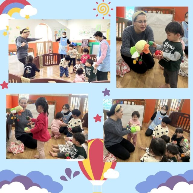 この日はお人形が登場しておままごとの食べ物を食べさせてあげましたよ🍇🍎🍊